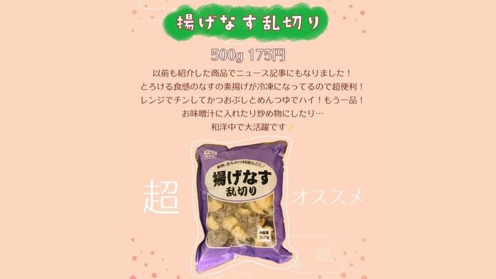 意外と手間がかかる揚げなすが冷凍になっているので、とても便利です。