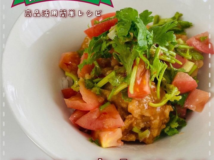 鶏竜田揚げを好みの方法で加熱料理し、その間にスイートチリソースとマヨネーズを混ぜておく。鶏竜田揚げとトマト、パクチーを加えて混ぜ、ごはんにのせて出来上がり。