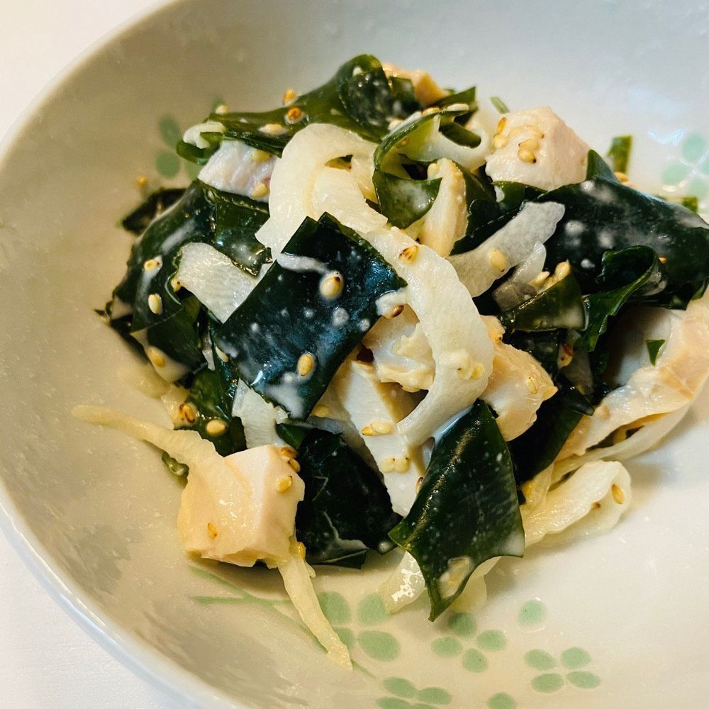 スモークチキンスライスを食べやすい大きさにカットして、ワカメとスライスした新玉ねぎを和えてサラダにしました。