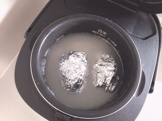 お米を炊くついでに、よく洗ったじゃがいもをアルミホイルで包んで普通の水加減より少しお水を多くして炊飯器のスイッチをオン!