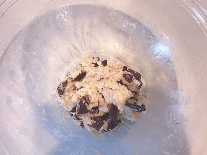 2、1のボールにホットケーキミックス、牛乳、砕いた板チョコを入れて混ぜます