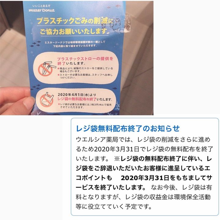 私の身の回りではミスタードーナツやウエルシア薬局で4月1日からレジ袋が有料になるようです。