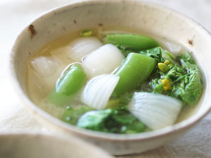 そんな今日は、走りの菜の花、新玉ねぎ、スナップえんどうをたっぷり使った、春の味噌汁をご紹介させて頂きます。