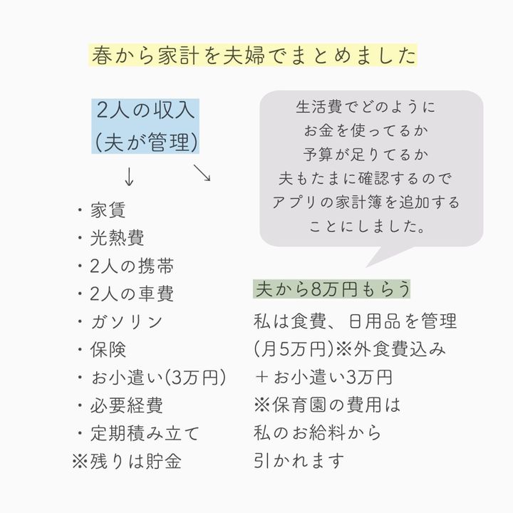 夫婦で話し合った結果、春から夫婦のお小遣い制の導入や、固定費の見直し、家計簿の管理方法、生活費の予算の組み直しを行うことに。