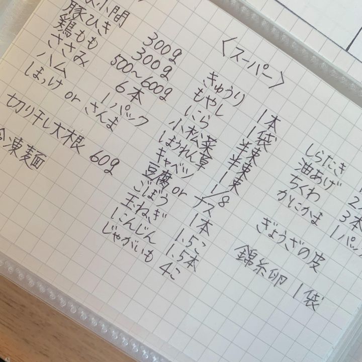写真のように使う食材をリストアップしておけば、1週間分の買い物を短時間で済ませることができます。
