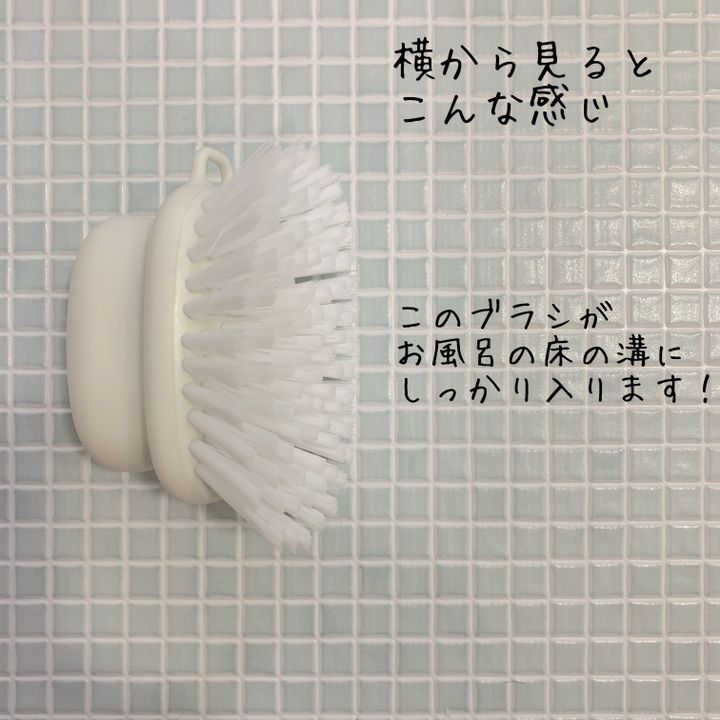 横から見ると分かると思うのですが、このブラシは毛足が長めです。この毛がお風呂の床の溝にしっかり入り、力を入れずに汚れを落とすことができます。ちなみに我が家のお風呂の床はTOTOのほっからり床です。他のメーカーのお風呂も写真のような溝のあるものが多いですよね。この溝の掃除が結構大変だと感じていましたが、マーナのブラシだと簡単に汚れが落とせるので、掃除をするのが少しだけ楽しくなりました。(少しだけね)