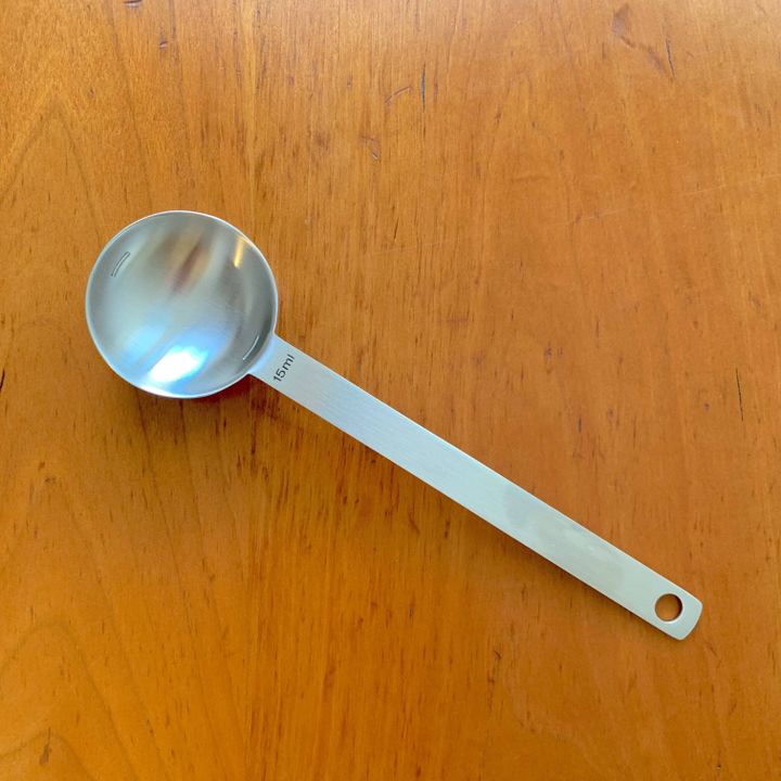 もうひとつのよさは、柄が長いのでボールや容器の中に水没しないことです。柄が短い計量スプーンを使っていた時には、調味料を量った後にボールや容器に計量スプーンを立てかけて、気が付いたら計量スプーンが水没していた……なんてことがよくありました。