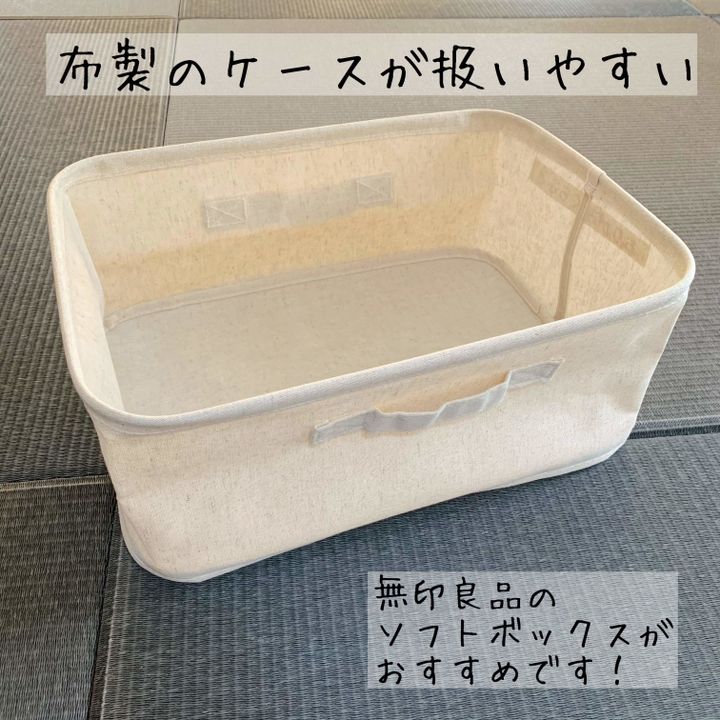 布製のやわらかいケースを使っています。やわらかい素材の方が子どもたちが扱いやすいですし、安心感があります。おもちゃをケースごと出して遊ぶ時に持ち運びやすく、おもちゃのガチャガチャという音がかなり軽減されます。