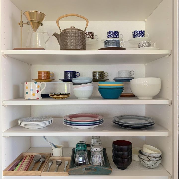 使わない食器は手放しました。種類の違う食器は重ねないこと、隙間を空けることを意識して収納しています。