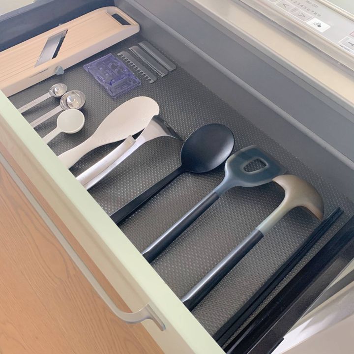 キッチンツールは、コンロ下の引き出しに置いています。本当に使っている物だけで、余計な物はありません。コンロ下なので、必要な時にパッと取り出せます。また、並べているだけなので元に戻すのも簡単です。