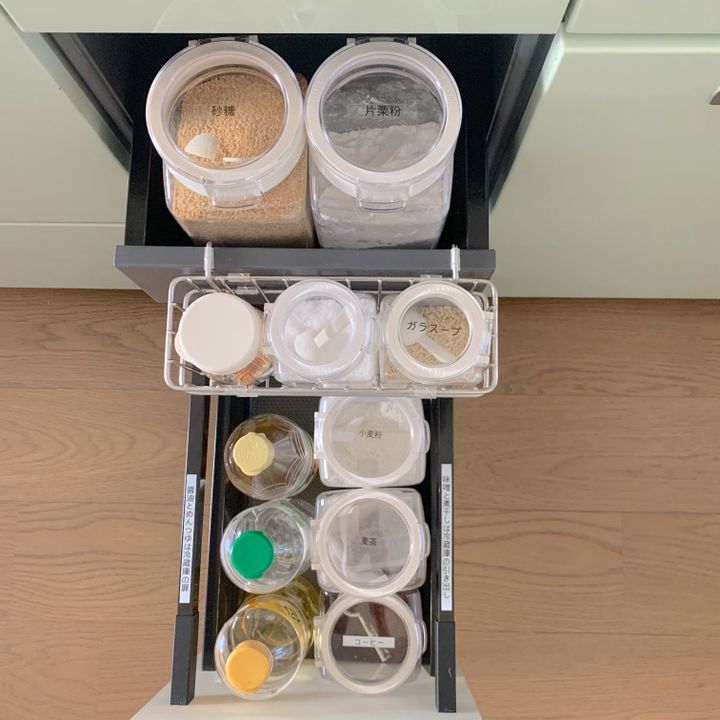 常温で保存できる調味料は、一歩も動かずに取り出せるコンロ横の引き出しに入れています。また、自分が使いこなせる調味料だけしか買わず、種類を増やさないようにしています。
