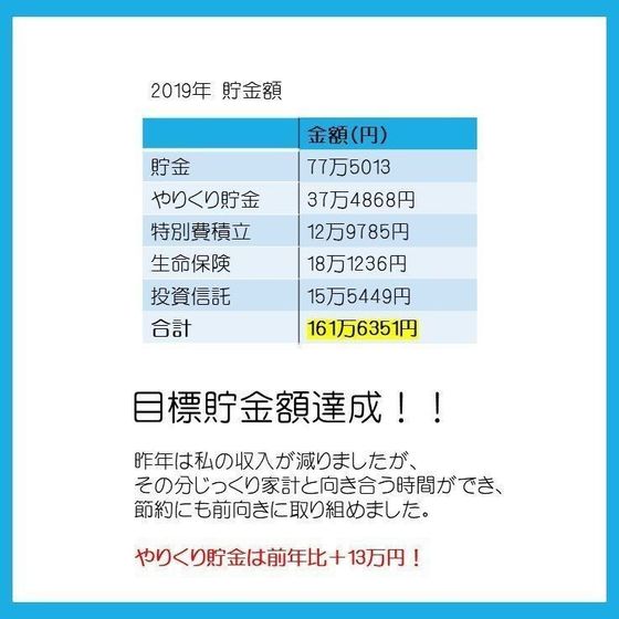 2018年の年間貯金額は夫のおかげでなんとか103万円。昨年はやりくりを本格的に始めたことで1年間で161万円の貯金に成功!
