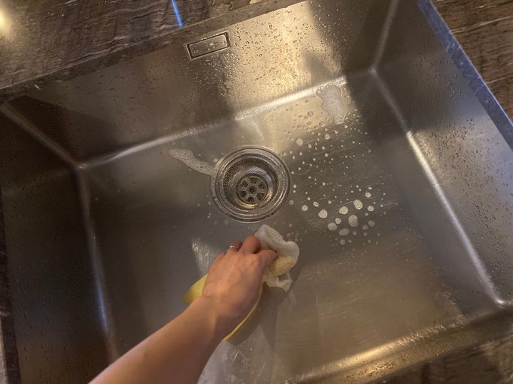 いつもはさーっと磨いていますが、スポンジ交換の時はいつもより入念に磨きます。排水口周りも磨いてスッキリ!これにてスポンジのお役目は終了です。