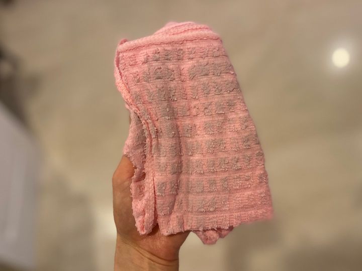 マイクロファイバークロスは汚れがよく取れるので、キッチンと洗面所に1枚ずつ置いています。ダイソーでは2枚組で売っていました。乾拭きの雑巾は使い古しのタオルを使用し、終わったらそのままゴミ箱へポイ。マイクロファイバークロスは洗って乾かします。