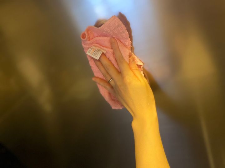 ガスコンロがあって水をバシャーっとかけられないため、マイクロファイバークロスを水で濡らし硬く絞って拭き上げました。その後は乾いた雑巾で乾拭きして終了!