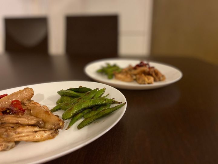 ①枝豆に塩を揉み込み、フライパンで焦げ目がつくまで素焼きにする。