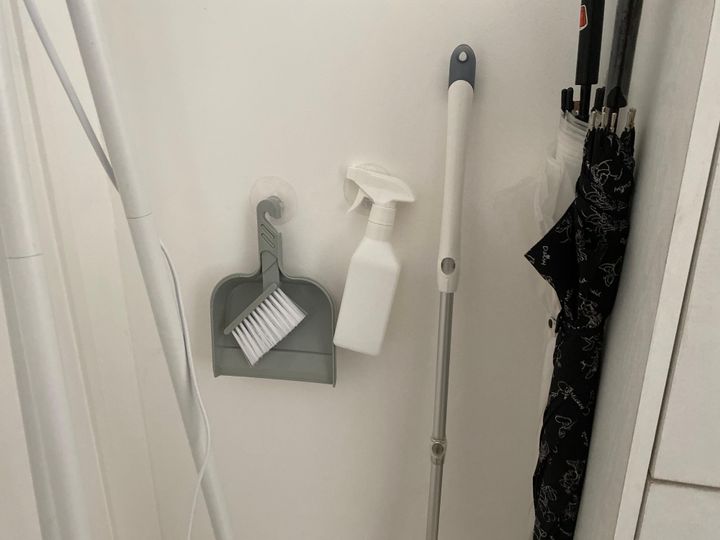 すぐ手に取れるようリビングの近くに吊るして収納したかったので、ちいさいホウキを選びました。色味もグレーで悪目立ちしないので隠す必要も無くなりました。使い勝手も悪くない。ちょっと掃除したい時に大きなちりとりは必要ありませんでした。