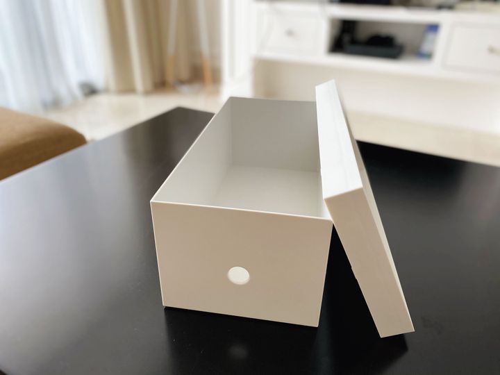 今回購入したのは、無印良品の【ポリプロピレンファイルボックス・スタンダードワイド・ホワイトグレー1/2】。約幅15cm、奥行32cm、高さ12cmのものです。内服薬にホコリが被らないようにフタが欲しかったので、【キャスターもつけられるフタ 幅15cm用】も購入しました。