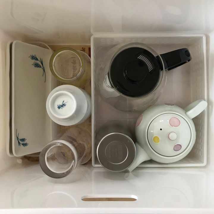 ティーポットやコップ、お皿の収納にはニトリの【Nインボックス レギュラー】とダイソーの【積み重ねボックス 大・細型】や収納ケースがぴったりでした。こちらに収納しているのは使用頻度の低い食器です。食器棚の奥に仕舞っておくと取り出すのが面倒ですが、インボックス収納にしたら使う時にサッと取り出せるようになりました。