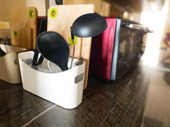 使用頻度の高い菜箸、お玉、ピーラーなどのキッチンツールは仕舞い込まずに出しっぱなしにしています。一つにまとめたいけど、取り出す時に柄の部分が絡まってスムーズに取り出せないことがプチストレスでした。