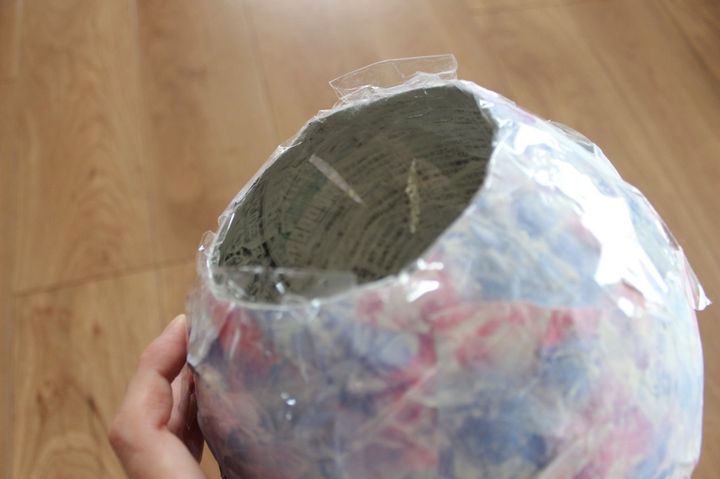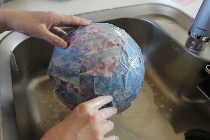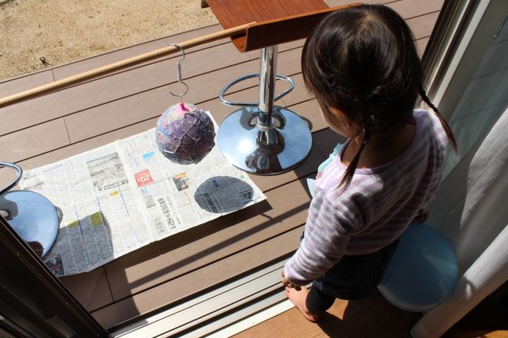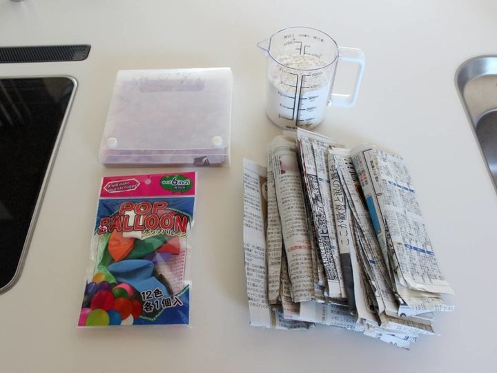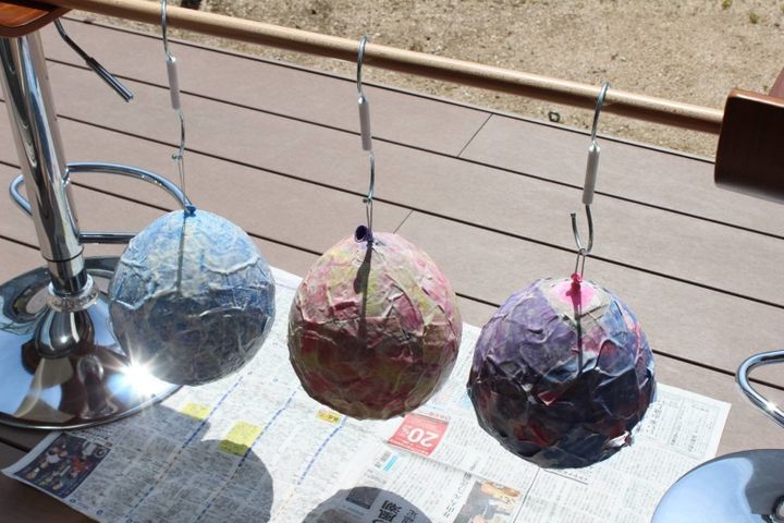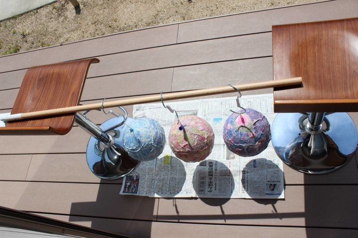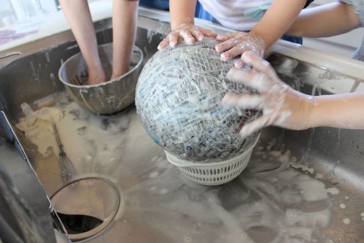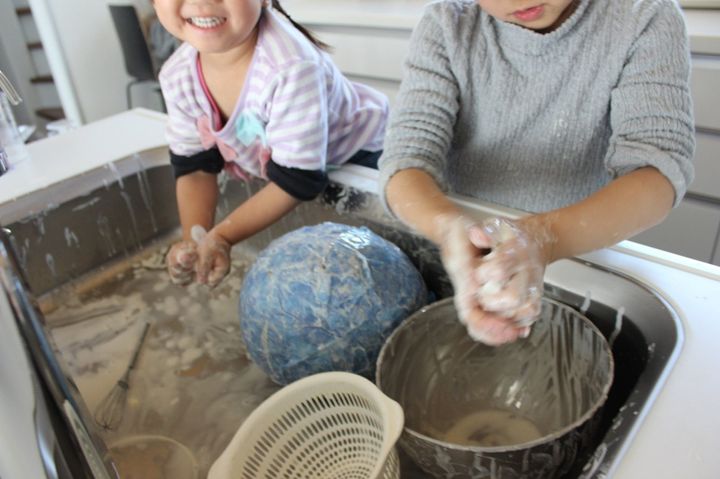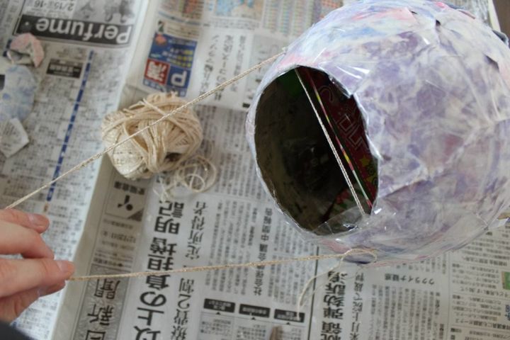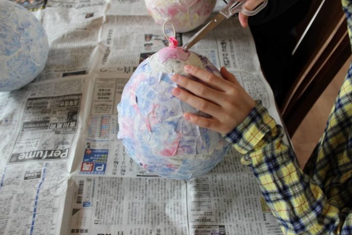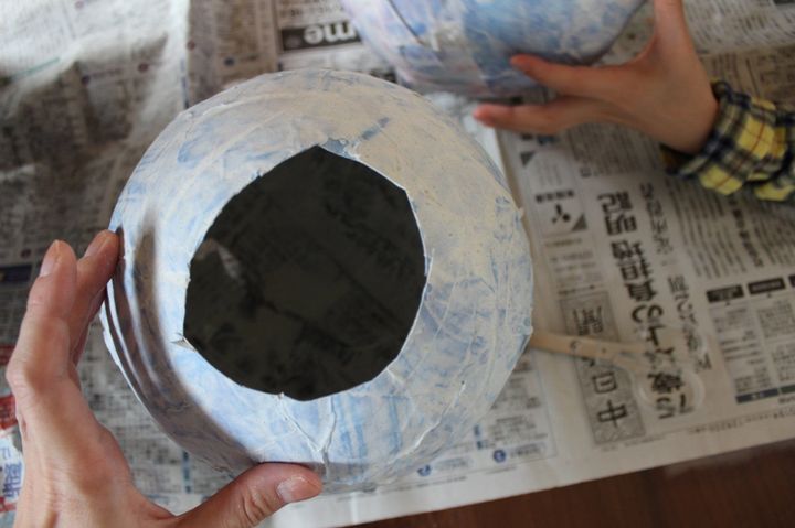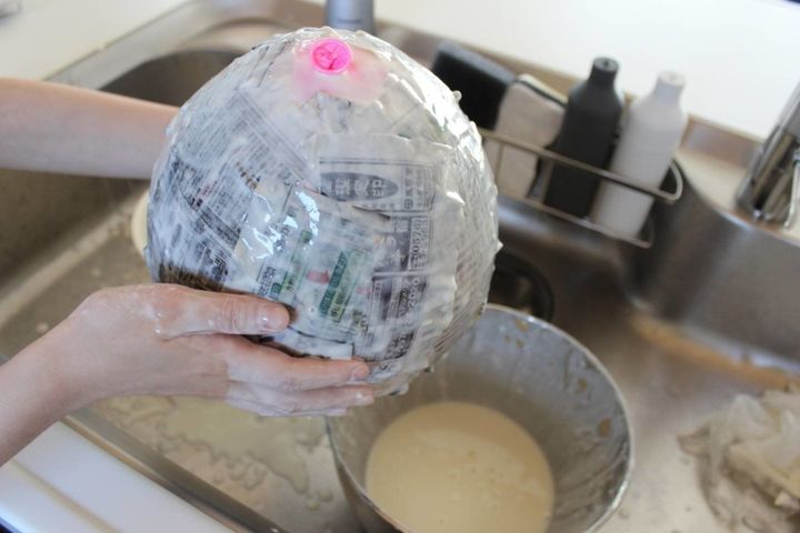 水と小麦粉を溶かした糊を新聞紙につけて、膨らました風船に貼り付けていきます。
