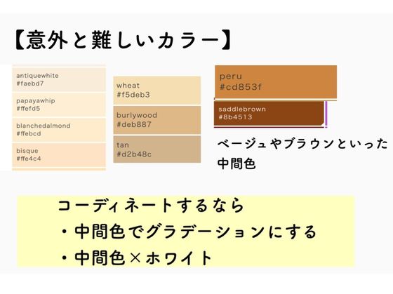 ベージュ、ブラウンという中間色をカラーコーディネートで取り入れるのは、案外難しい。