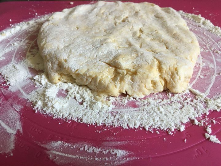 ⑷全体が混ざったら一塊りにして、打ち粉をした台に乗せる。1.5センチほどに掌で伸ばしたら、丸い型で抜く。