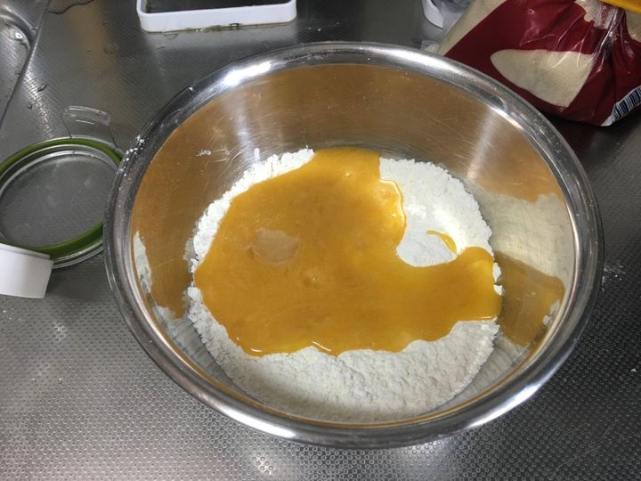 薄力粉と強力粉の分量は、合わせて180gになるくらいで。