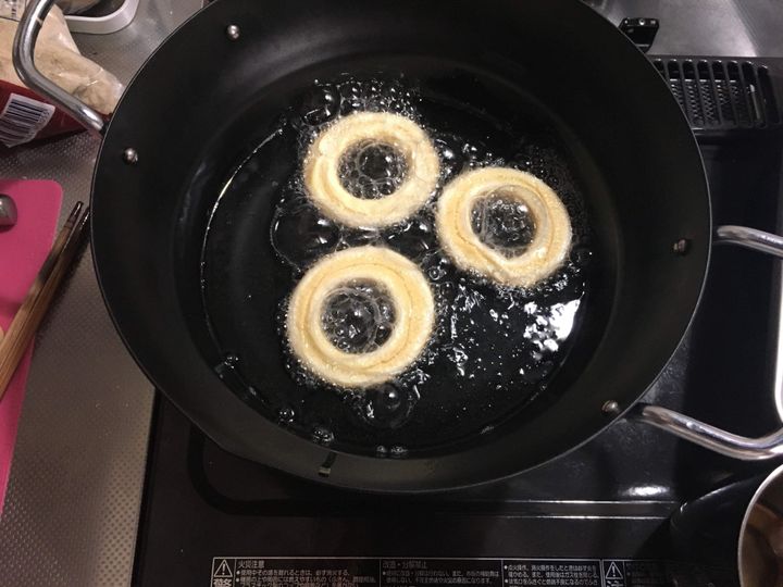 ⑹170度の油に、筋をつけた方を上にして入れて、2分半。反対にして2分揚げる。