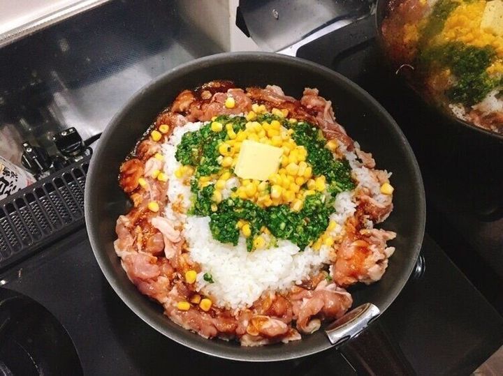 ⑷お肉の上に混ぜた調味料をかけて、コーンとネギを散らせて、バターを乗せる。