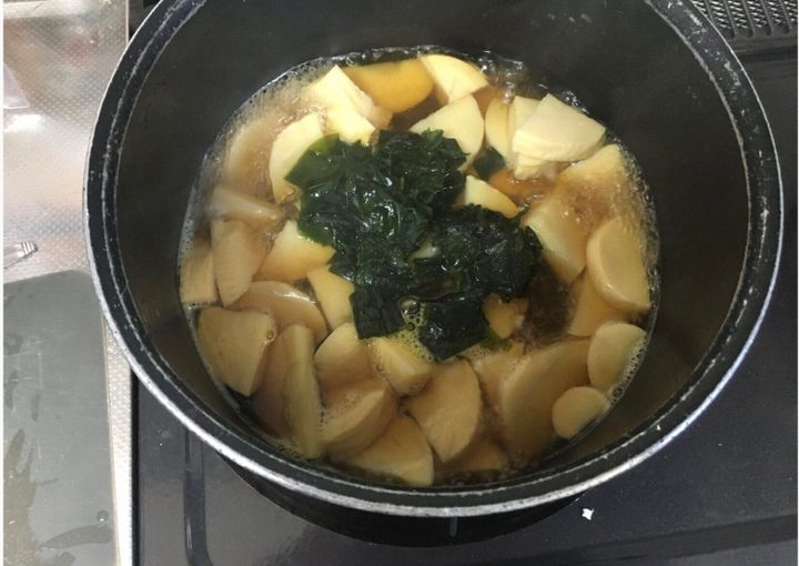 ⑶弱火ににして、わかめを入れて、もう一煮立ちさせたら出来上がり。
