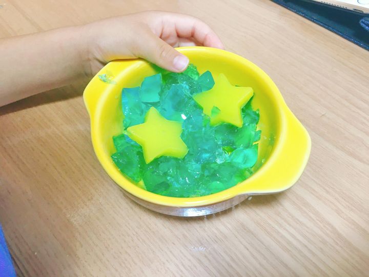 ポリ袋にあおぞらゼリーと、星型ゼリーをいれて、透明寒天液をスプーン2〜3杯ほど混ぜる。