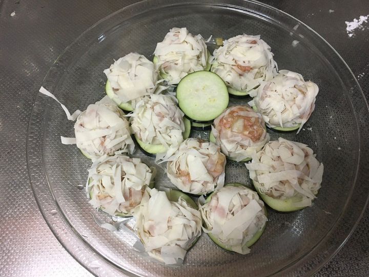 ⑶ラップに細切りにしたしゅうまいの皮を乗せて、その上にピンポン玉大のタネを乗せて、皮で包み込んでいく。