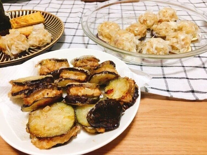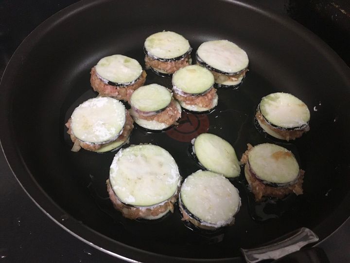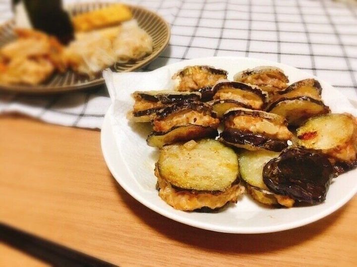 下に敷いたナスも、二分の1本分ほど残ったので、挟んで、揚げ焼きにしました。