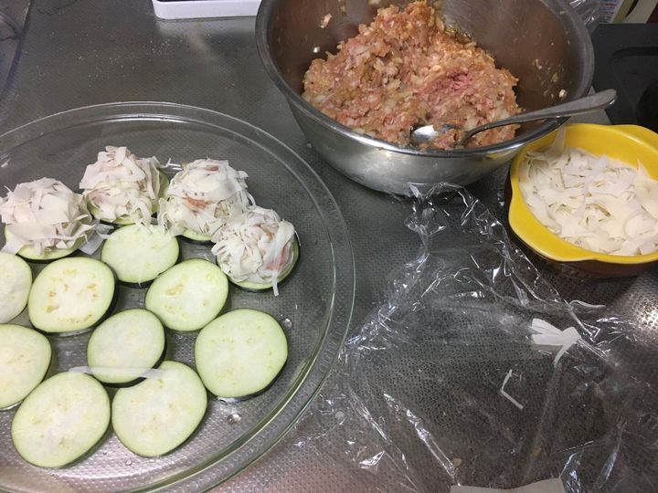 ⑴玉ねぎはみじん切りにして、ナスは薄い輪切りにして水にさらしておく。