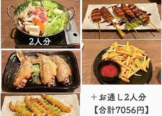 ワンドリンク制、お通し代含み、たっぷり食べて、7056円でした。