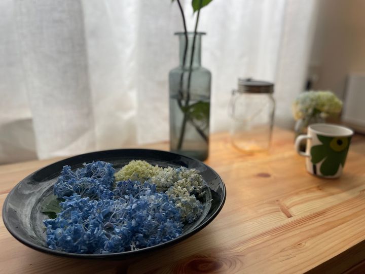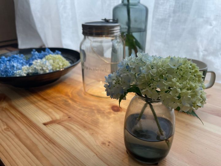先日紫陽花を買ってきましたが、晴れの日の紫陽花と雨の日の紫陽花の印象が全く違うとに驚きました。