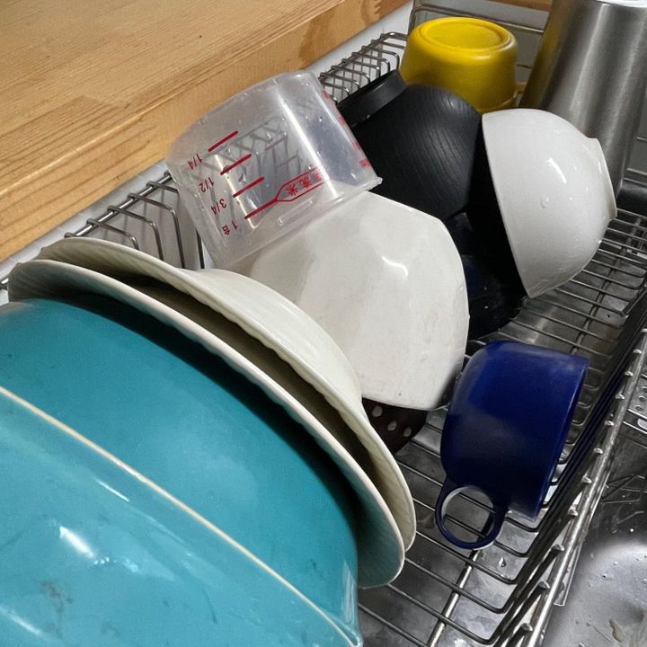 乾かし終わった食器は定位置に戻し、洗っていない食器は全てシンクに集めて、調理スペースには何も置かない状態を作ります。