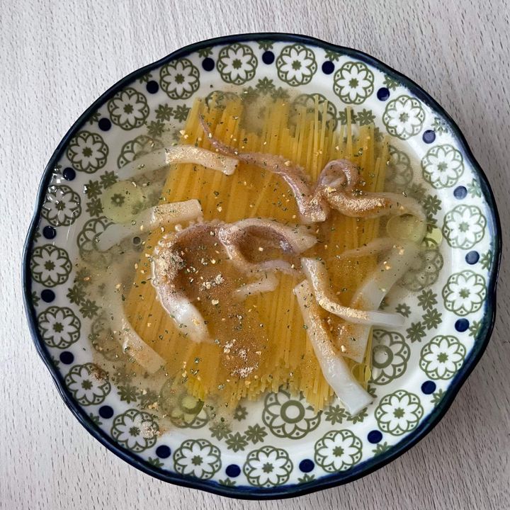 ・乾麺パスタ1束(半分に折ってお皿に入れる)