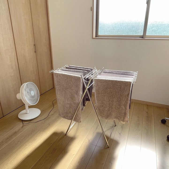 今までは上から吊るすパラソルハンガーでしたが、スタンド式に替えたことで、腕を上げずに干せるようになりました。たったそれだけのことですが、毎日のこととなるとそれが「地味〜にラク」なのです。