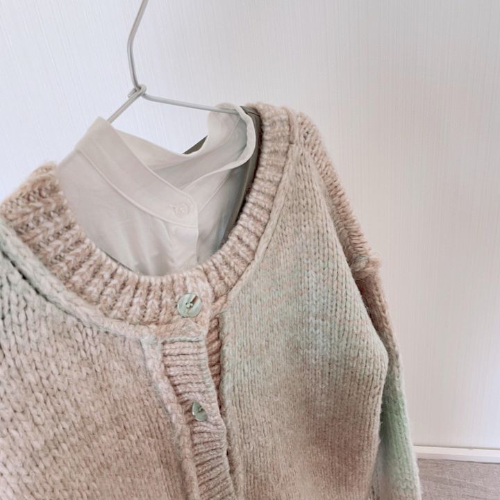 私の場合は、1番厚手のニットカーディガンを主役に、シャツワンピースとロングワンピースを重ね着しました。