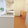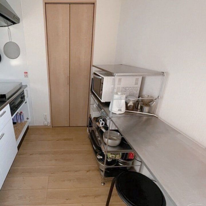 背面のキッチン収納は、専用の食器棚やレンジ台ではなく、無印良品の「ステンレスユニットシェルフ」を選びました。
