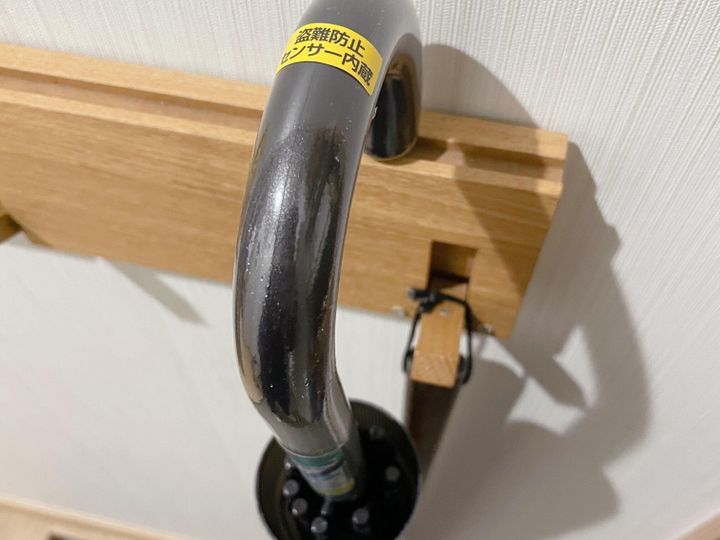 傘の持ち手部分に、「盗難防止センサー内蔵」と記載のステッカーを貼ってみました。