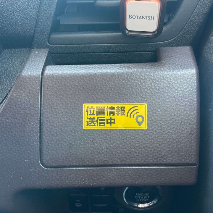 こちらもGPSの取り付けを検討中ですが、ひとまず運転席付近に「位置情報送信中」のステッカーを貼ってみることに。見栄えはあまり良くないですが、見えない場所に貼ると意味はないでしょう。
