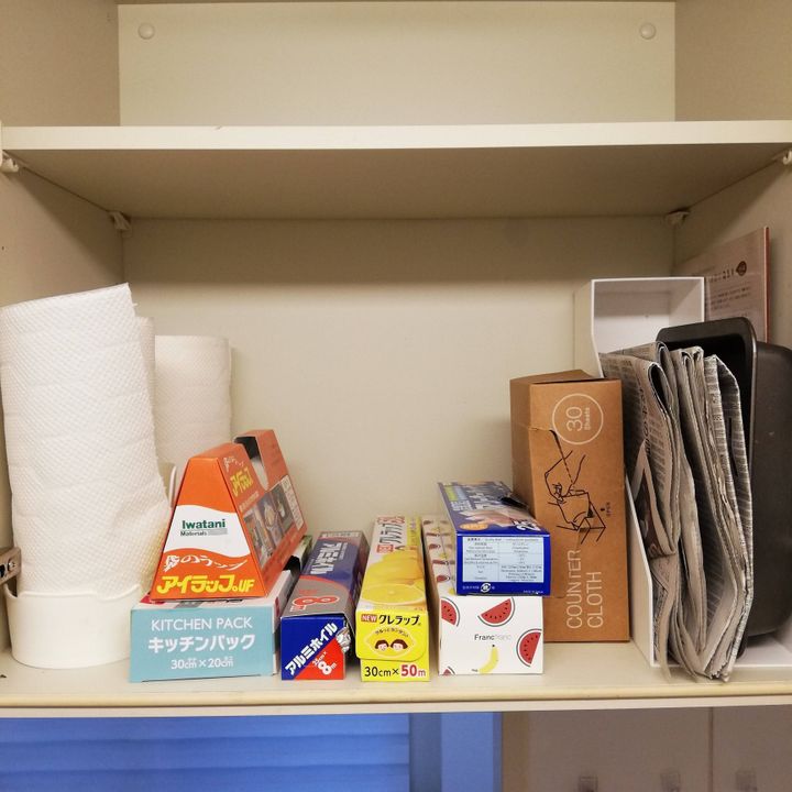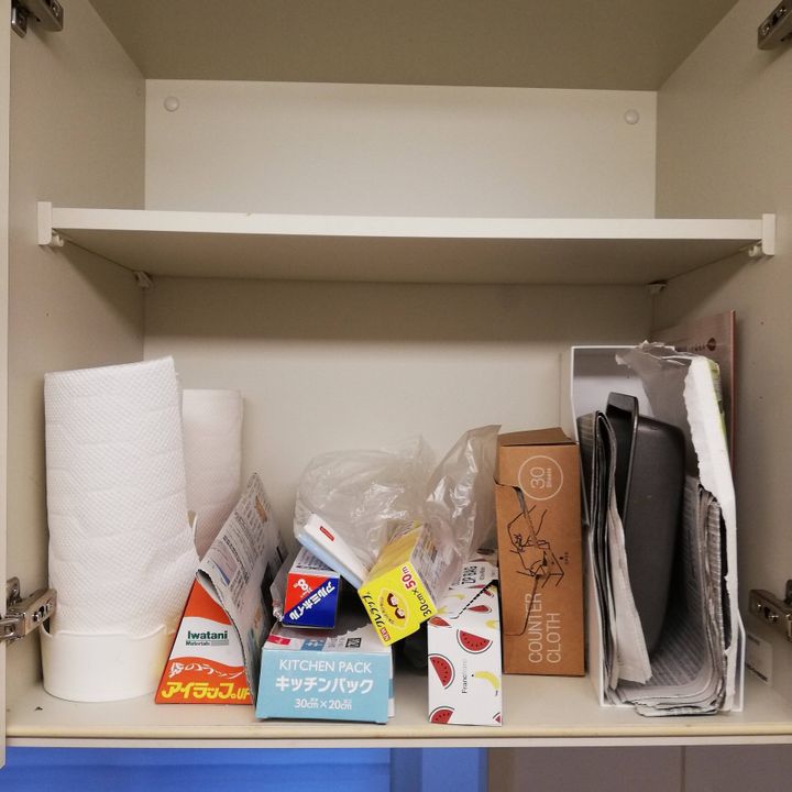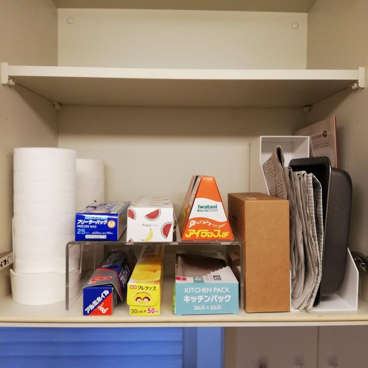 今回は、無印良品のコの字型をしたアクリル仕切棚を使って、吊り戸棚の収納を改善してみました。