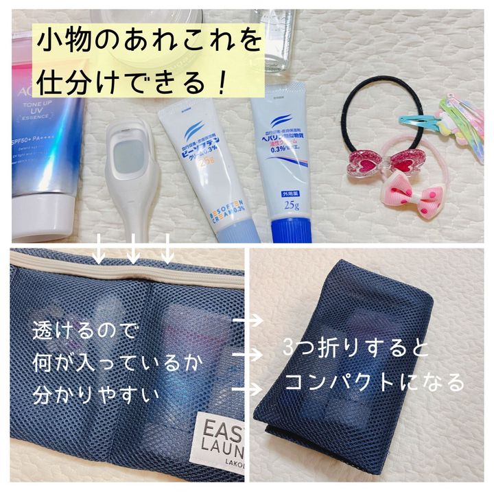 この3ポケットランドリーネットは旅行の荷物まとめアイテムとしても使えます。