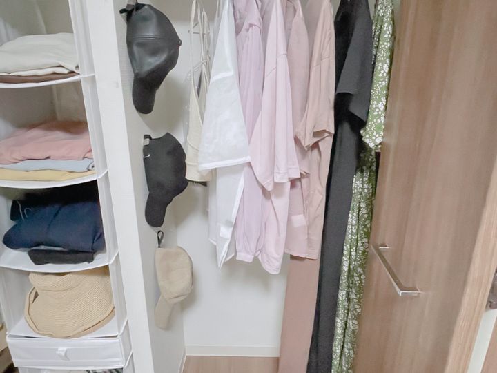 そこで、ボトムスの吊り収納を挟んで右半分を「今着る服」にまとめたところ、イメチェンもでき、季節に合わせてクローゼットが変化する楽しみも生まれました。