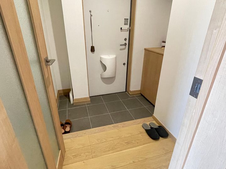 玄関は前のマンションよりも広めですが、収納量は半分ほどになりました。