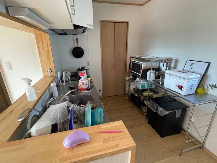 水切りカゴには前日の洗い物があり、朝出た食器などもシンク内に残っています。
