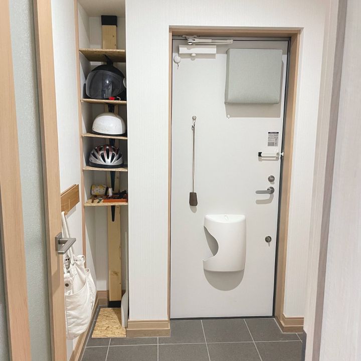 玄関に置くことで、出し入れしやすくなったのはもちろんのこと、防災対策にもなるので、もしもの時にも慌てずにサッと取ることができます。